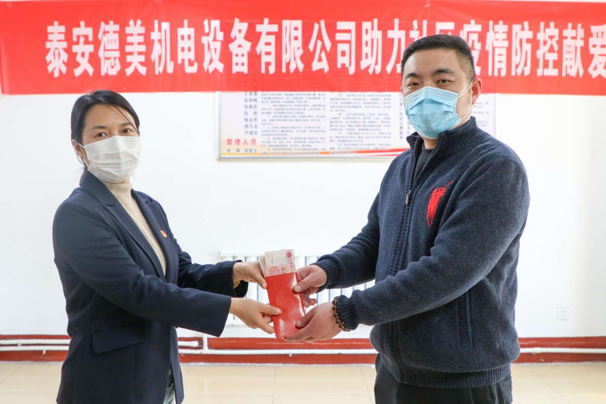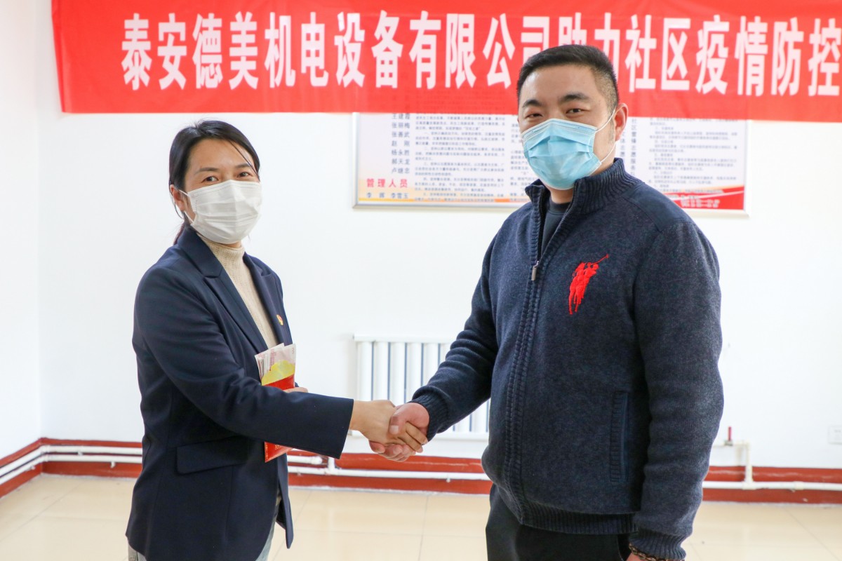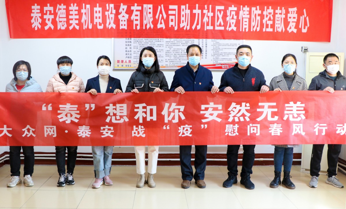 在疫情防控關(guān)鍵時(shí)期,泰安德美機(jī)電設(shè)備有限公司作為泰安國(guó)際商會(huì)副會(huì)長(zhǎng)單位、泰山區(qū)政協(xié)委員獻(xiàn)出愛(ài)心,通過(guò)市貿(mào)促會(huì)、區(qū)貿(mào)促會(huì)牽線搭橋,為鐵路新村捐贈(zèng)防疫物資,