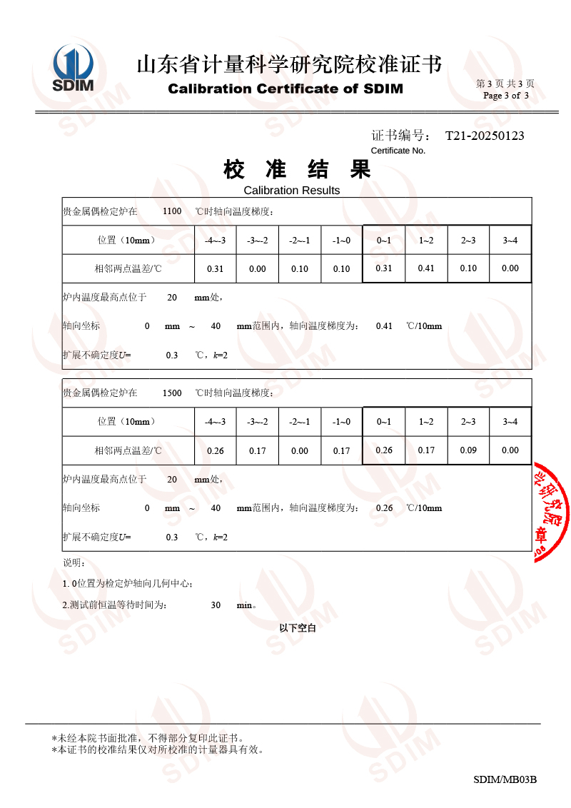 高溫貴金屬熱電偶檢定爐(800-1600℃)校準(zhǔn)證書