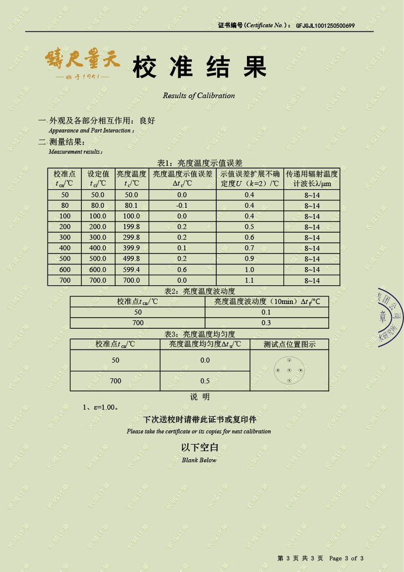 上一條:腔式黑體輻射源(50-700℃)校準(zhǔn)證書 | 下一條:超低溫面源黑體爐(-40-80℃)校準(zhǔn)證書 |
