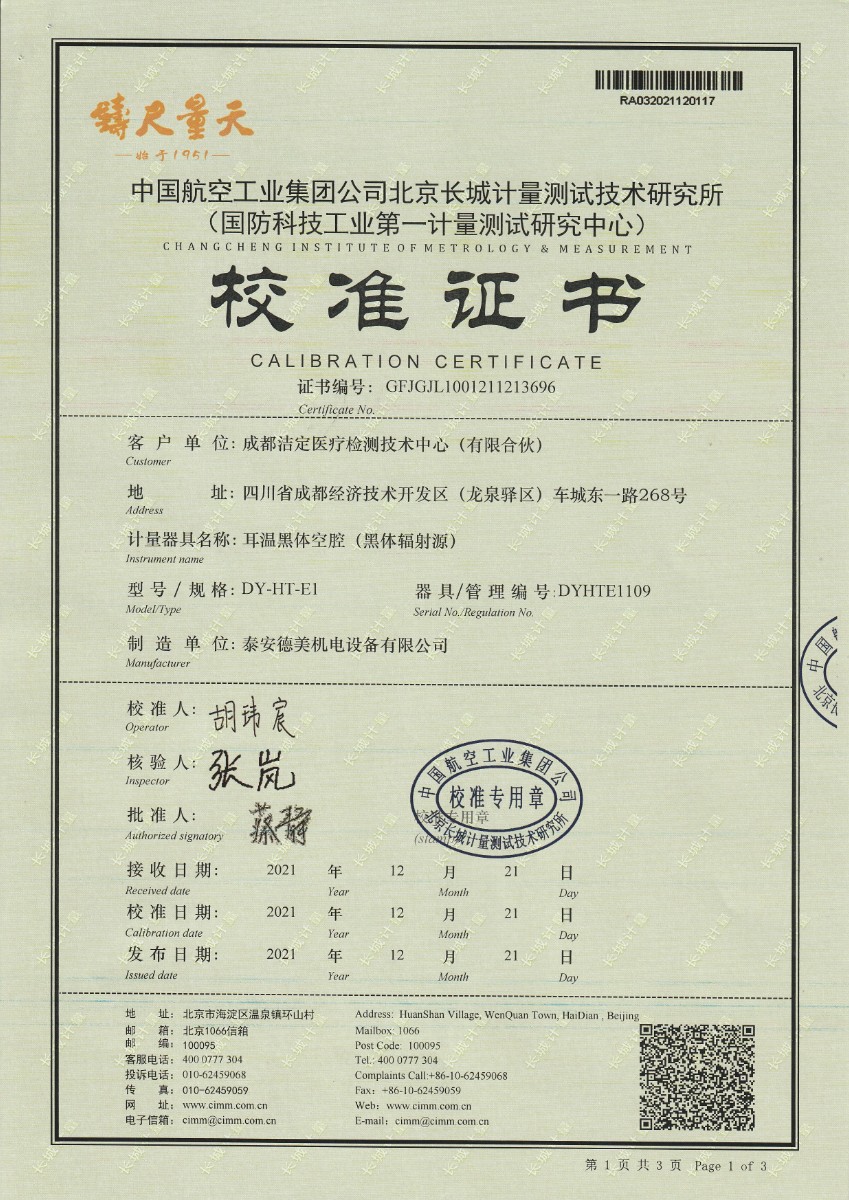 上一條:成都潔定醫(yī)療檢測技術(shù)-額溫黑體空腔下一條:超低溫面源黑體爐(-40-80℃)校準(zhǔn)證書