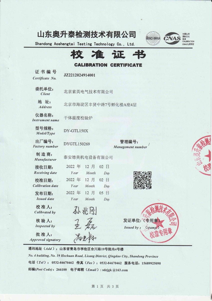 上一條:北京索英電氣技術(shù)有限公司 干體溫度校驗爐 | 下一條:便攜式干體爐(-30-150℃)校準證書 |