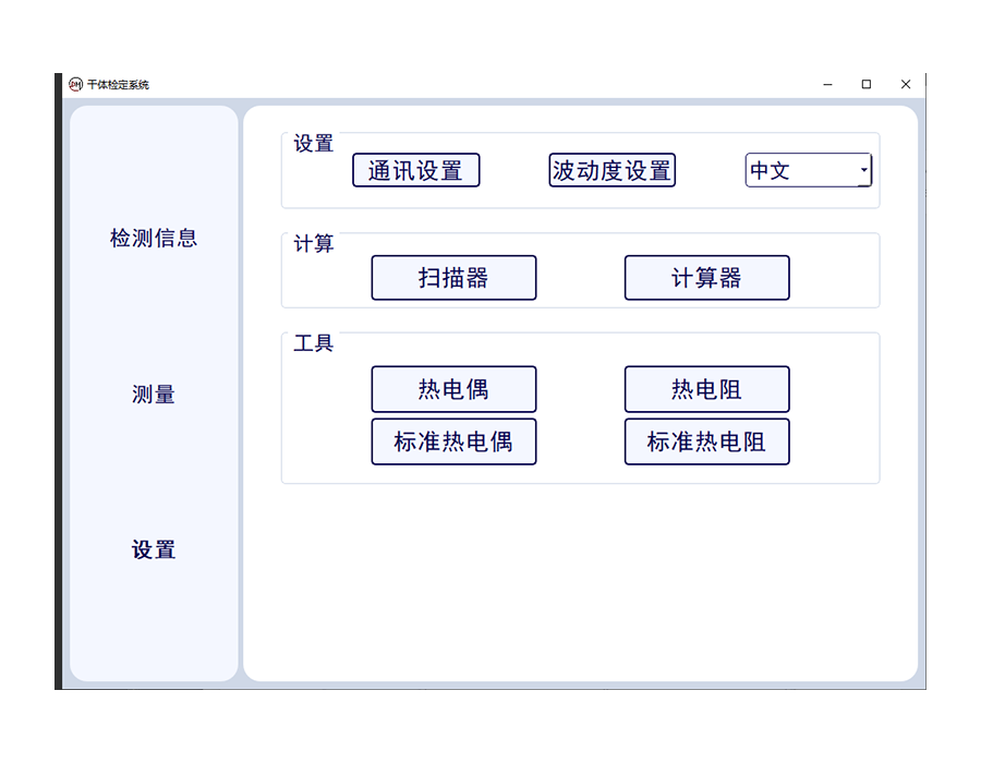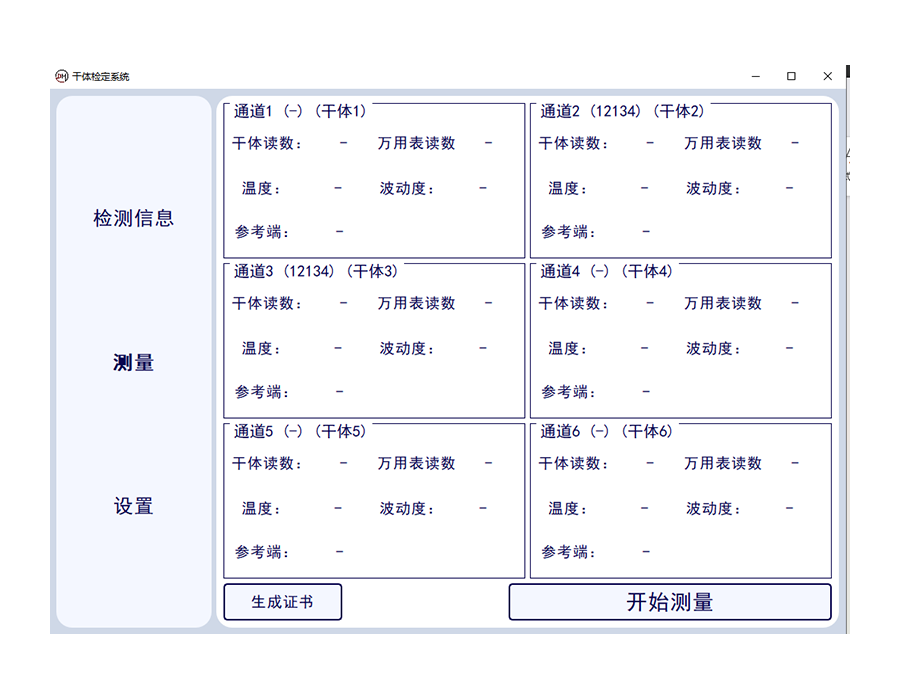 測量狀態(tài)可進(jìn)行多通道狀態(tài)干體爐,萬用表讀數(shù)。當(dāng)前標(biāo)準(zhǔn)器溫度,溫度波動性等數(shù)據(jù)的讀取,并一鍵生成證書。可實現(xiàn)一鍵中英文切換。