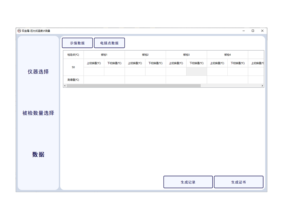 雙金屬溫度計(jì)軟件為DY-01熱工系統(tǒng)的配套軟件,可通過讀取雙金屬溫度計(jì)計(jì)壓力式溫度計(jì)數(shù)據(jù),記錄數(shù)據(jù)文件,并對數(shù)據(jù)文件進(jìn)行分析提取及計(jì)算,并可按照相關(guān)規(guī)程、規(guī)范輸出溫濕度場巡檢記錄及測試報(bào)告、證書等。