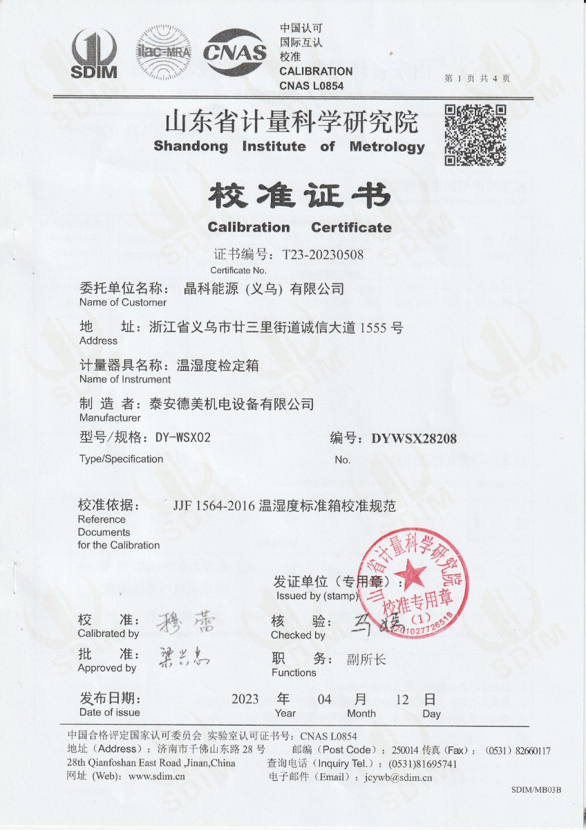 上一條:晶科能源(義烏)有限公司 精密露點儀(溫度)校準(zhǔn)證書 | 下一條:超低溫面源黑體爐(-40-80℃)校準(zhǔn)證書 |