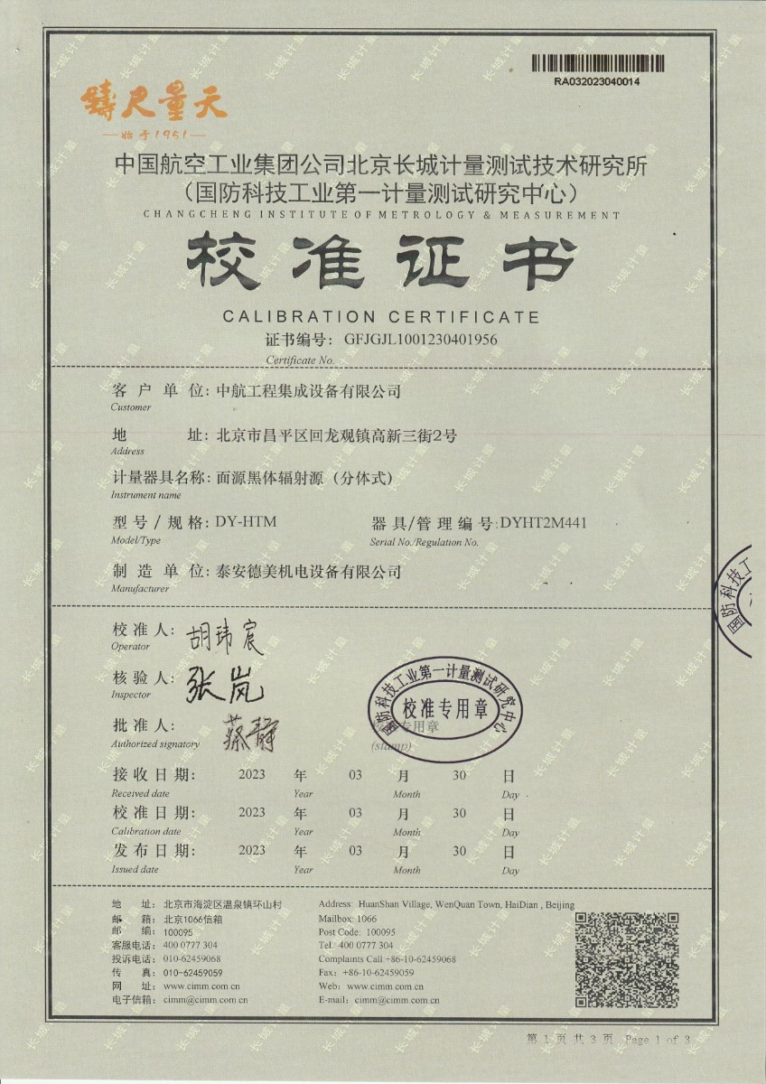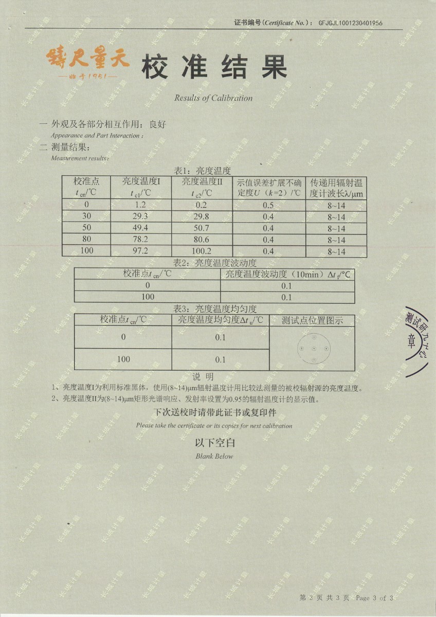 中航工程集成設(shè)備有限公司 面源黑體輻射源(分體式) 校準(zhǔn)證書 2023-5-4 本文被閱讀 12638 次