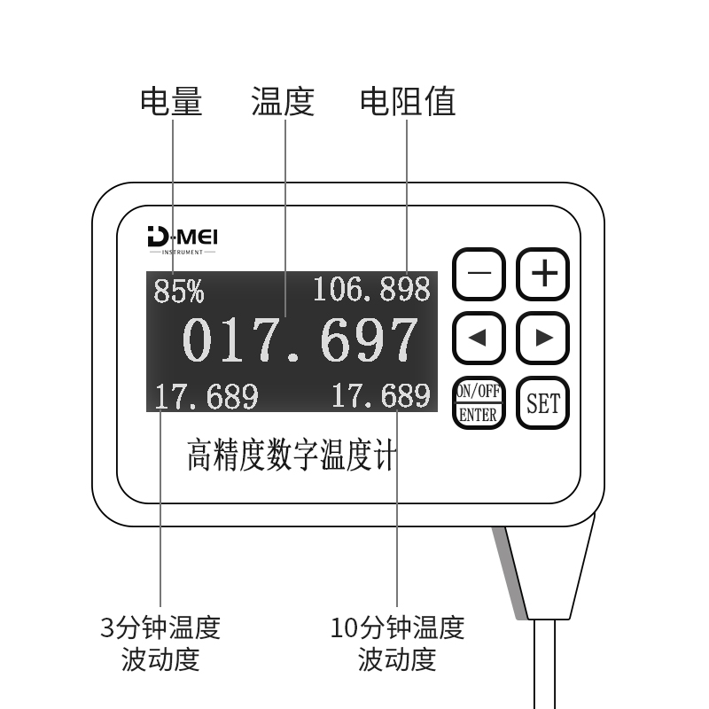 功能 | 實(shí)時(shí)顯示當(dāng)前溫度、電量顯示、電阻值、溫度波動(dòng) 度、10分鐘溫度波動(dòng)度自動(dòng)跟蹤計(jì)算、測(cè)試功能 | |