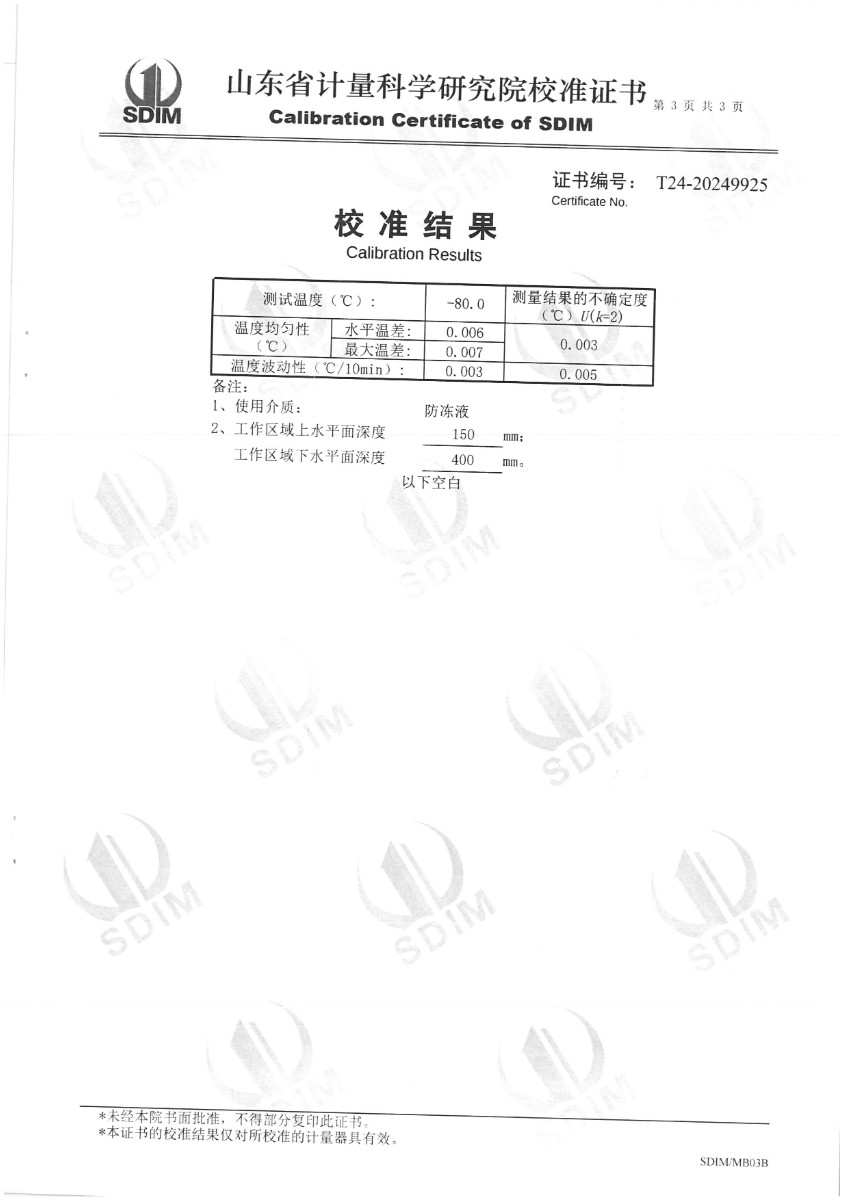 制冷恒溫槽(-80~95℃)校準(zhǔn)證書 2024-6-26 本文被閱讀 5977 次