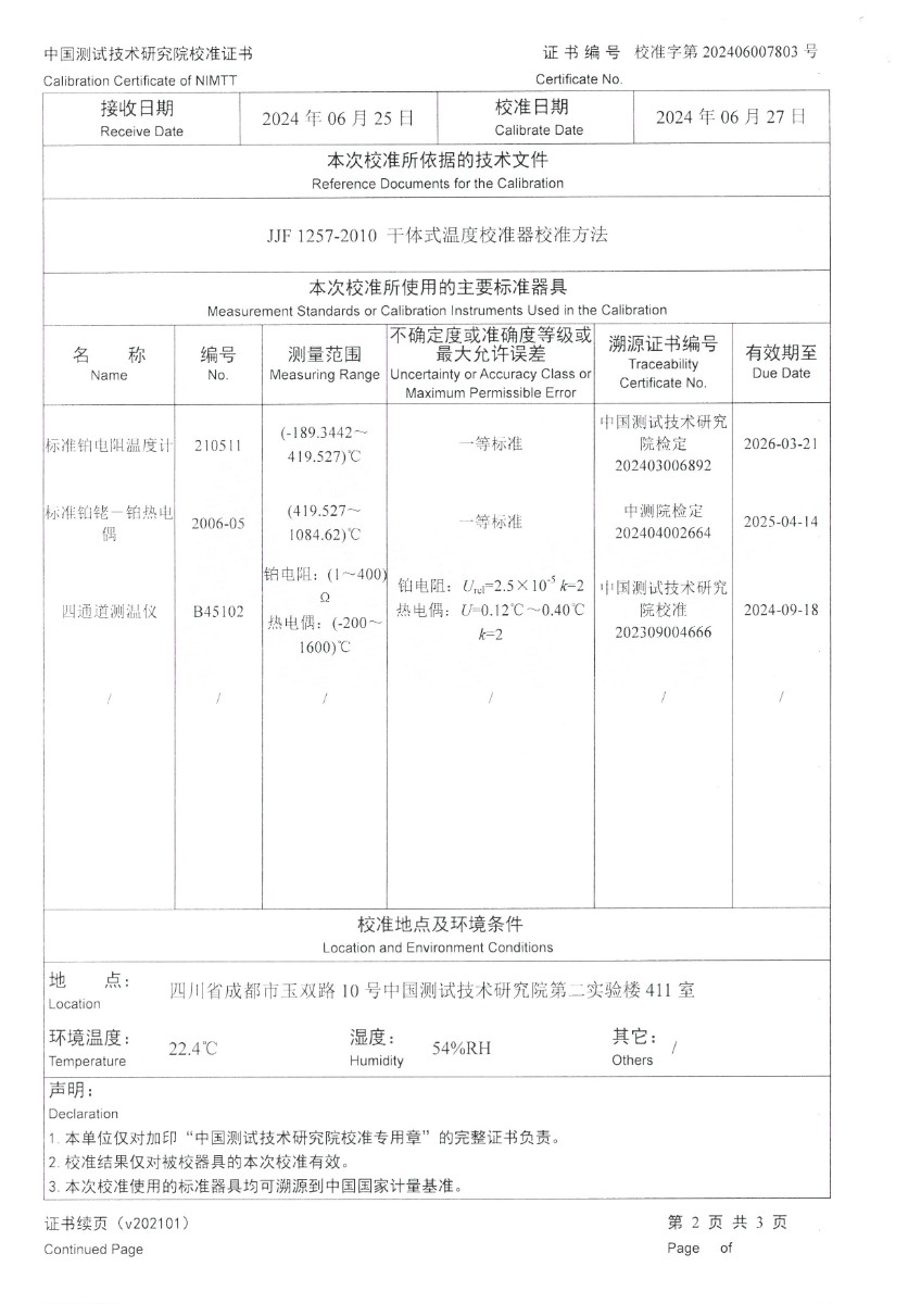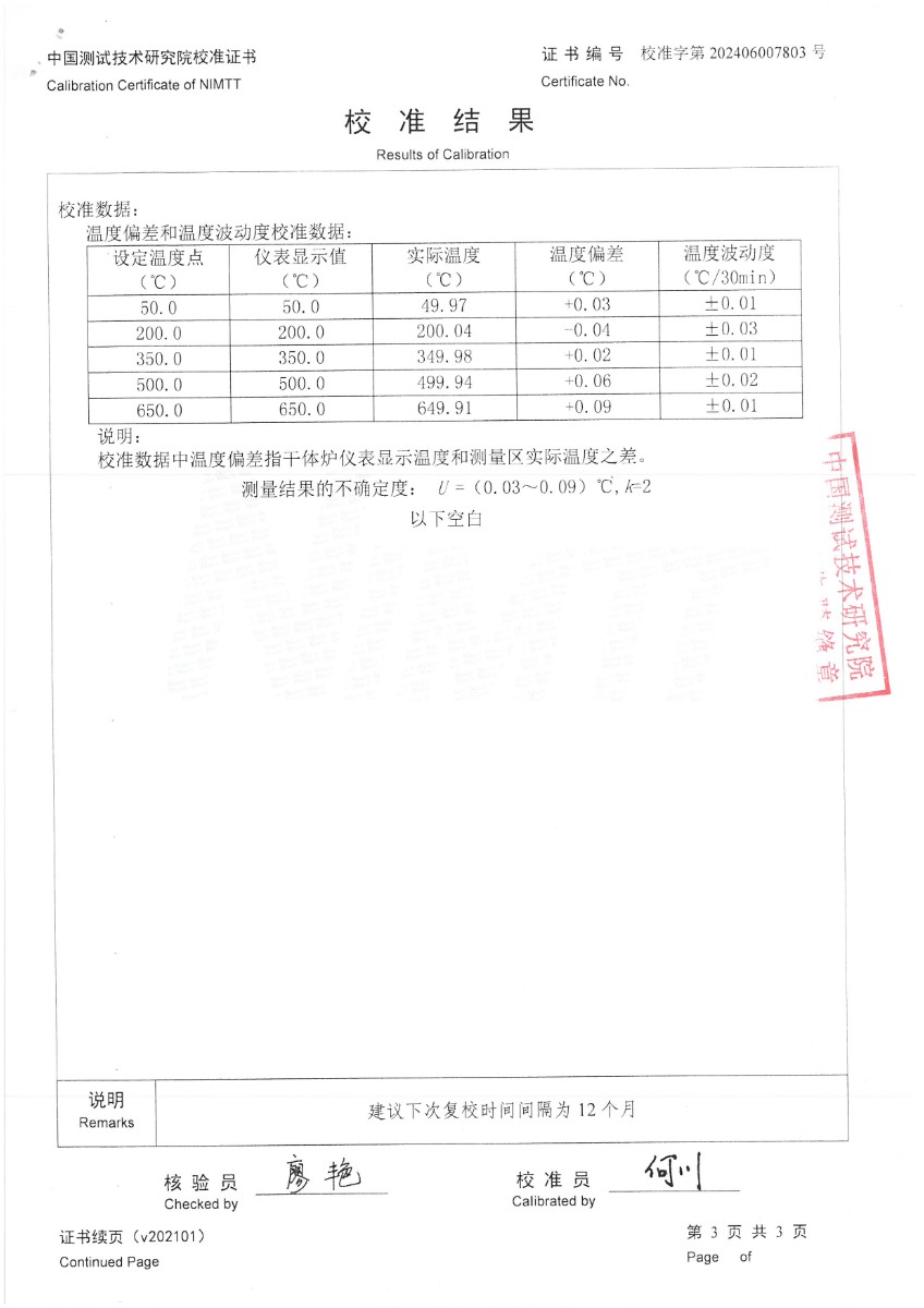 中溫干體爐(50~650℃)校準證書 2024-7-1 本文被閱讀 6063 次