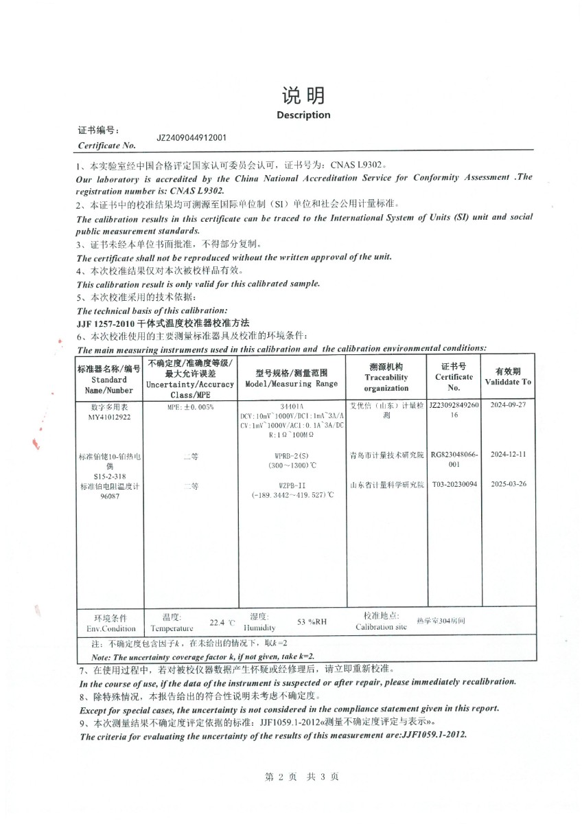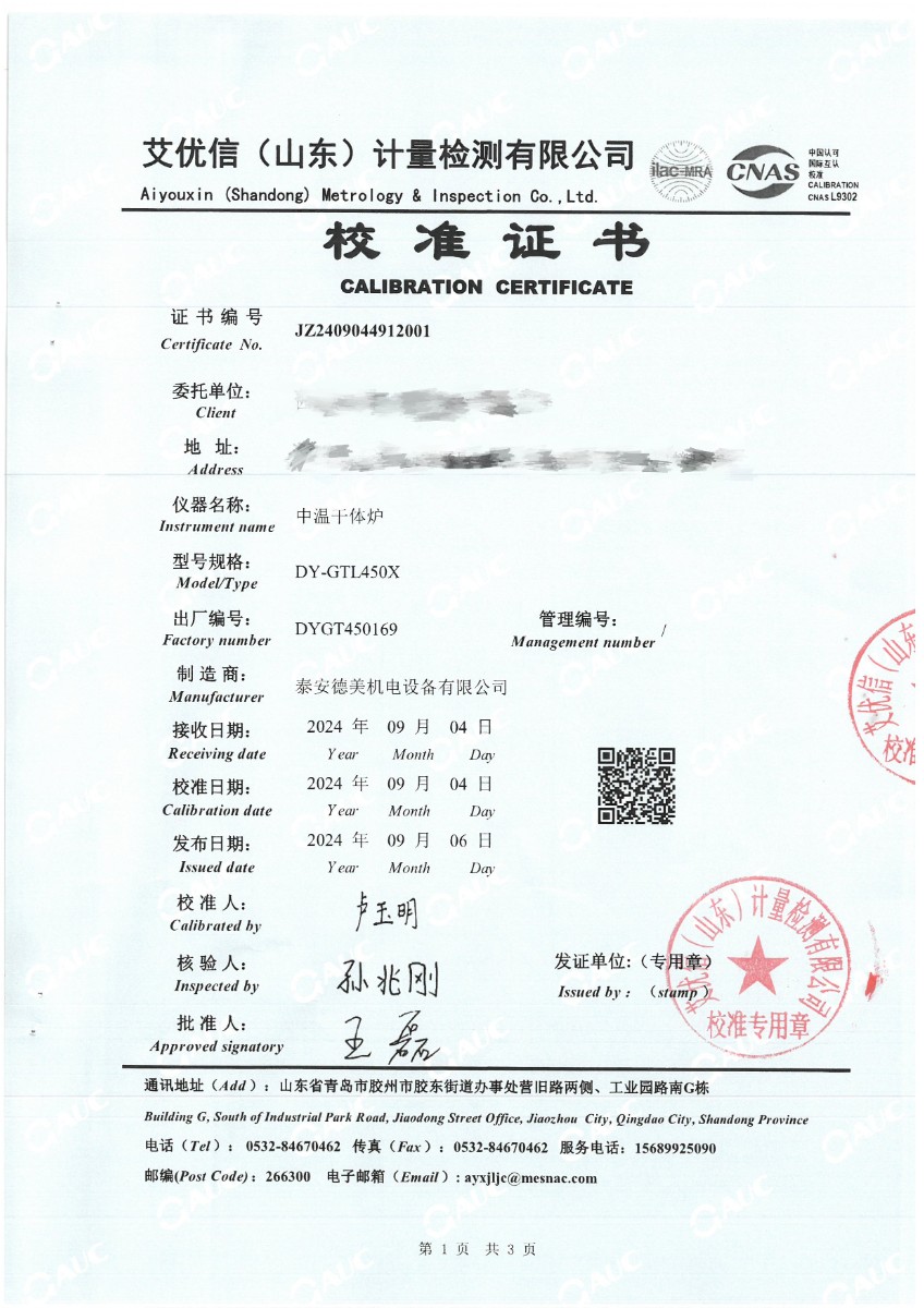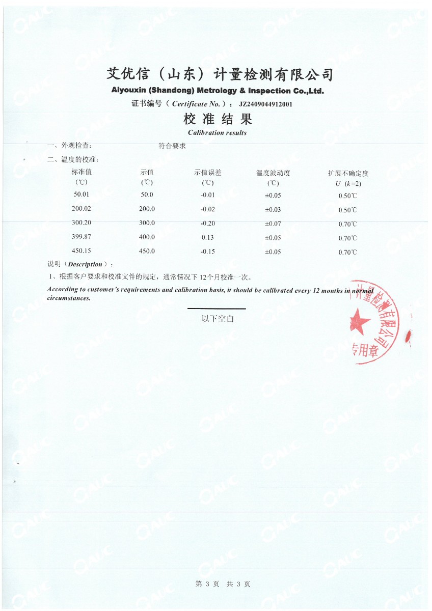 中溫干體(50~450℃)校準證書 2024-9-18 本文被閱讀 6271 次
