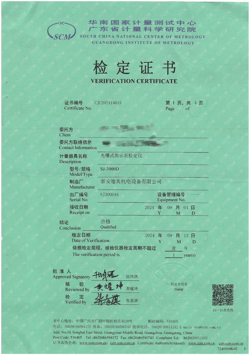 光柵式指示表檢定儀檢定證書 2024-9-20 本文被閱讀 6088 次