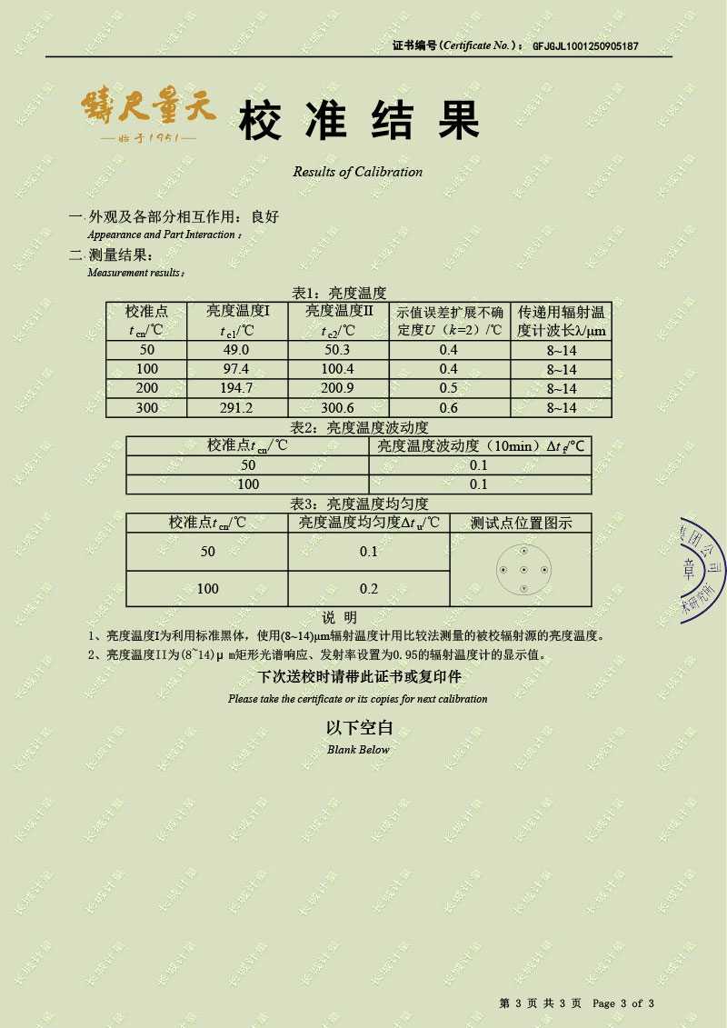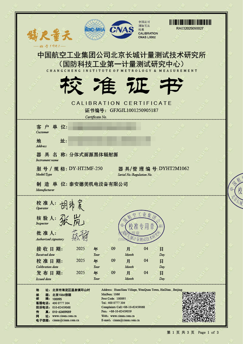 分體式面源黑體輻射源(室溫+5-300℃)校準證書 2025-9-12 本文被閱讀 1179 次