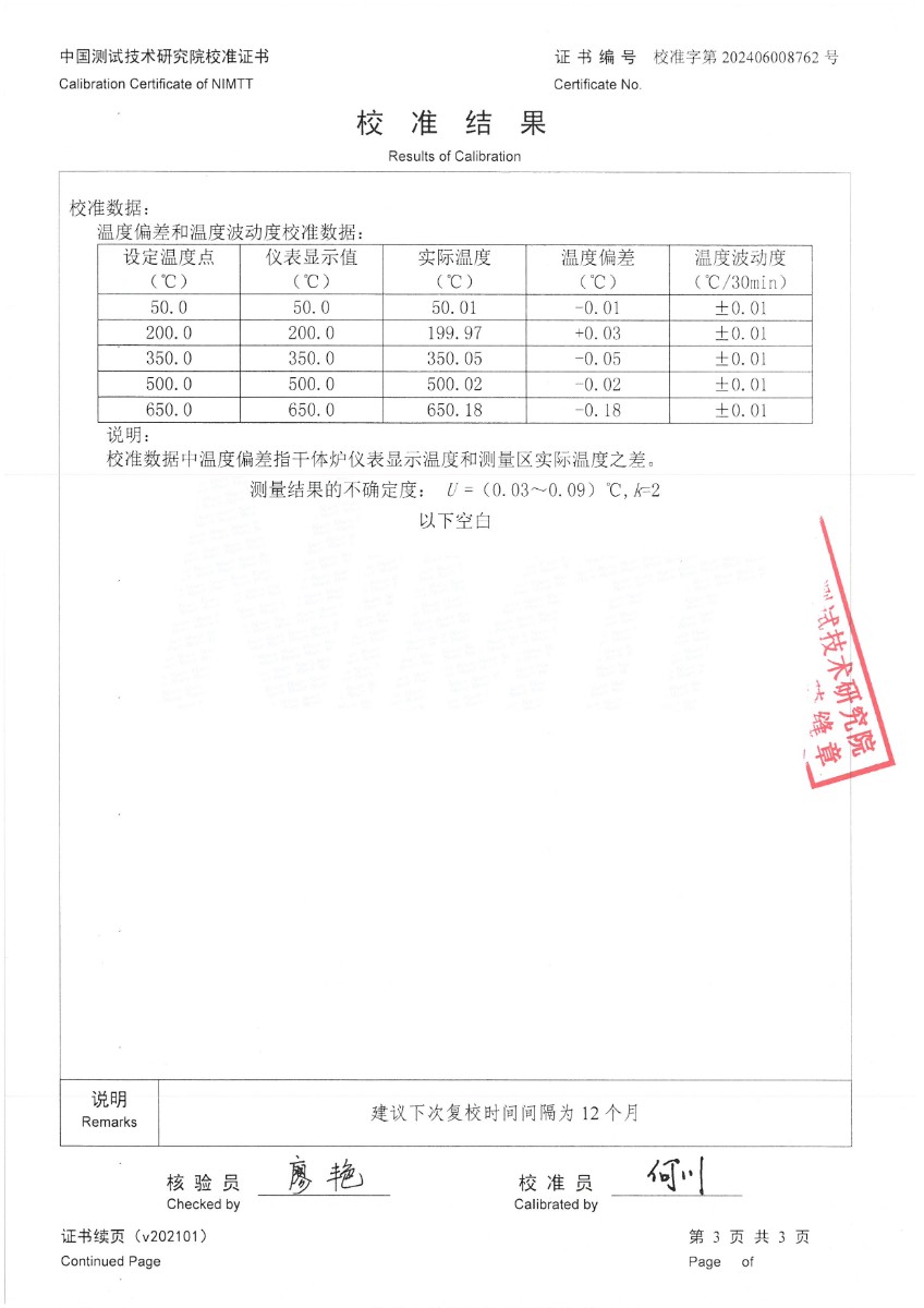 中溫干體爐296(50~650℃)校準證書 2024-7-6 本文被閱讀 6272 次