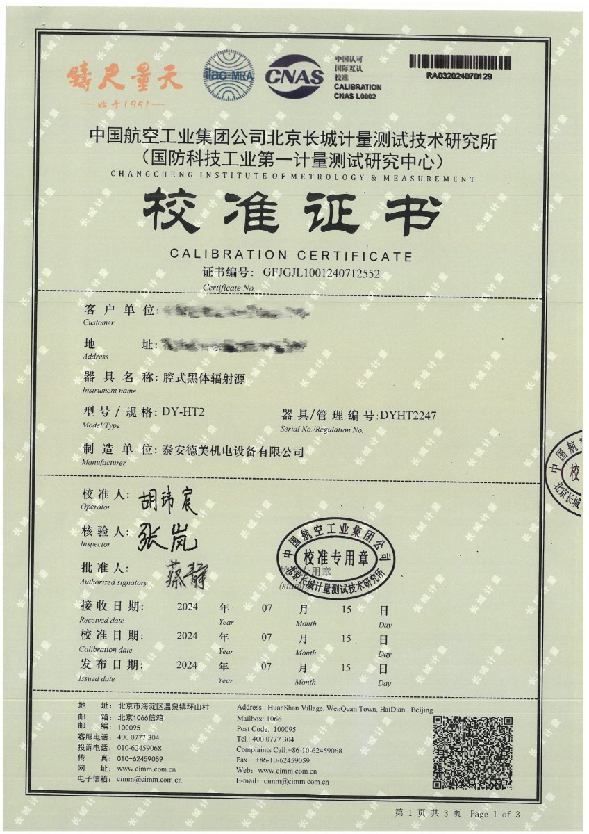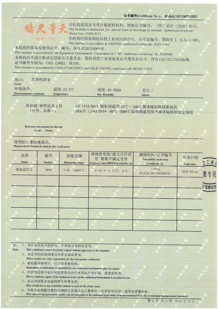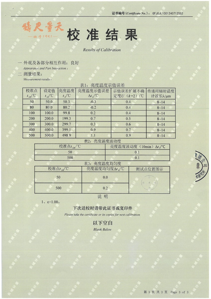 腔式黑體(50~500℃)校準證書 2024-7-29 本文被閱讀 7467 次