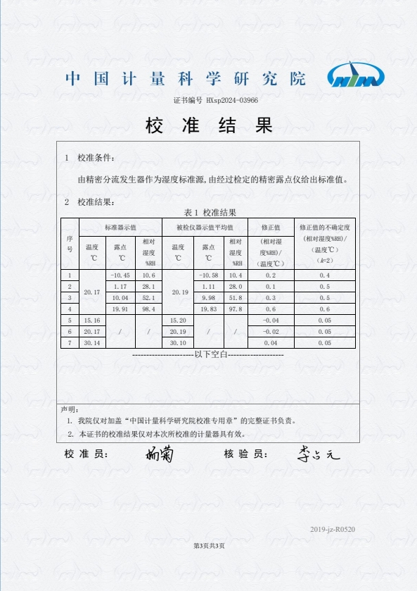露點(diǎn)儀校準(zhǔn)證書
