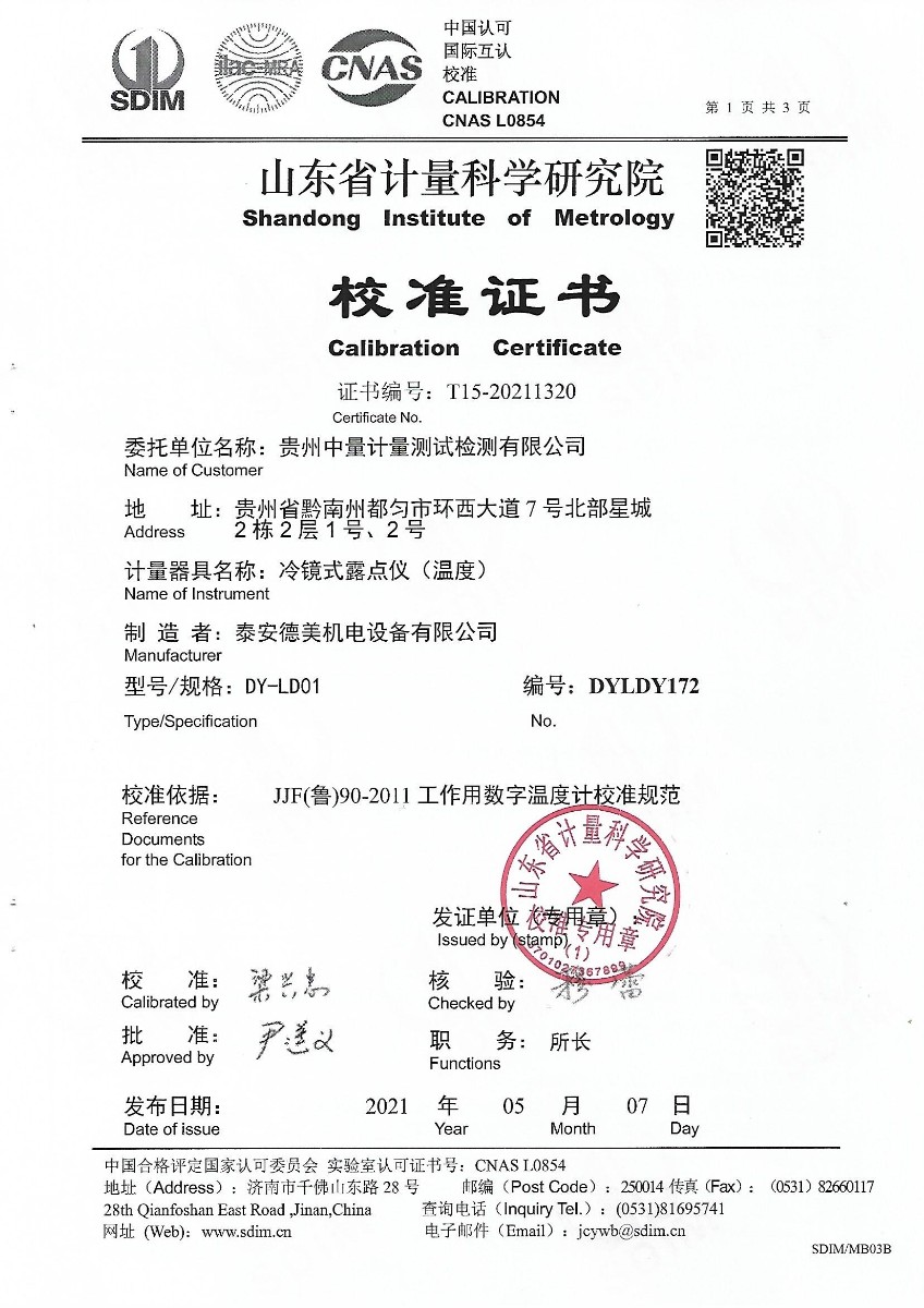 貴州中量計量測試檢測有限公司-冷鏡式露點儀校準證書 2021-5-15 本文被閱讀 15098 次