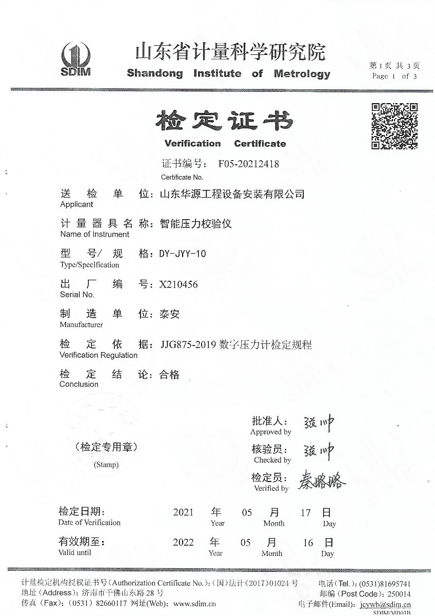 | 上一條:山東華源工程設(shè)備安裝有限公司-智能壓力校驗儀X210455 | 下一條:便攜式溫濕度檢定箱(-10-60℃)校準證書 |