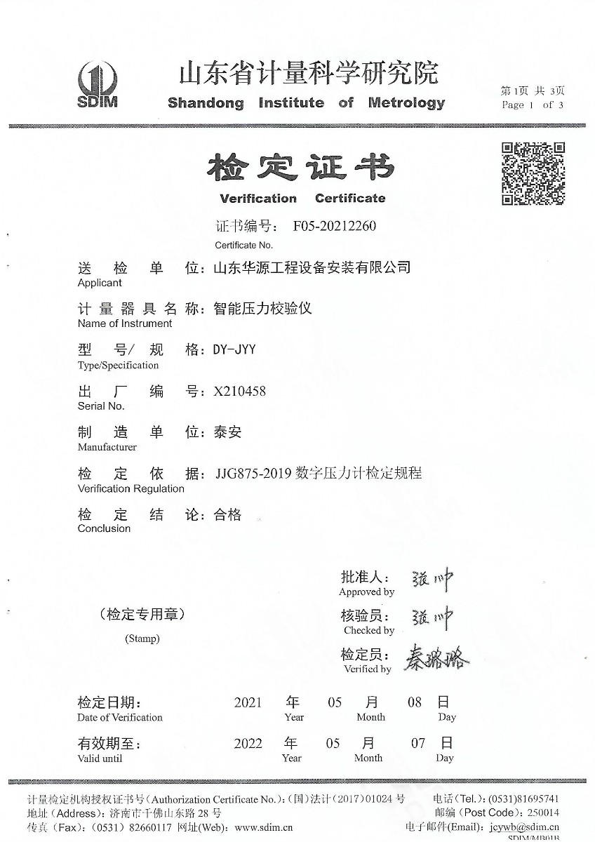 | 上一條:山東華源工程設(shè)備安裝有限公司-智能壓力校驗(yàn)儀X210457 | 下一條:便攜式溫濕度檢定箱(-10-60℃)校準(zhǔn)證書 |