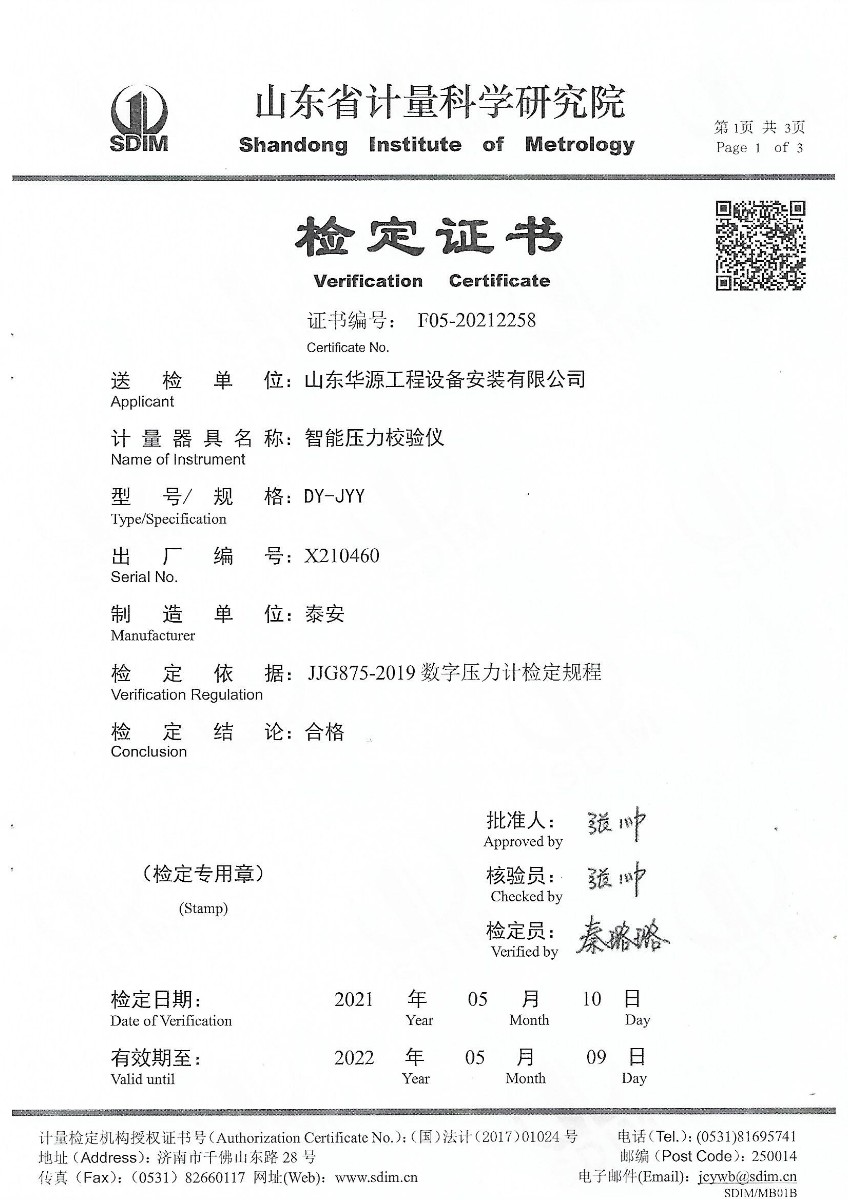 上一條:山東華源工程設備安裝有限公司-智能壓力校驗儀X210459下一條:便攜式溫濕度檢定箱(-10-60℃)校準證書