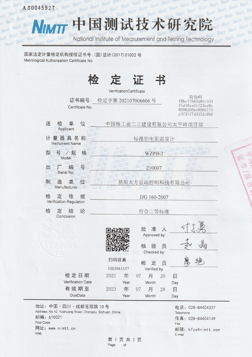 中國核工業(yè)二三建設有限公司太平嶺項目部-標準鉑電阻溫度計 2021-7-31 本文被閱讀 16008 次