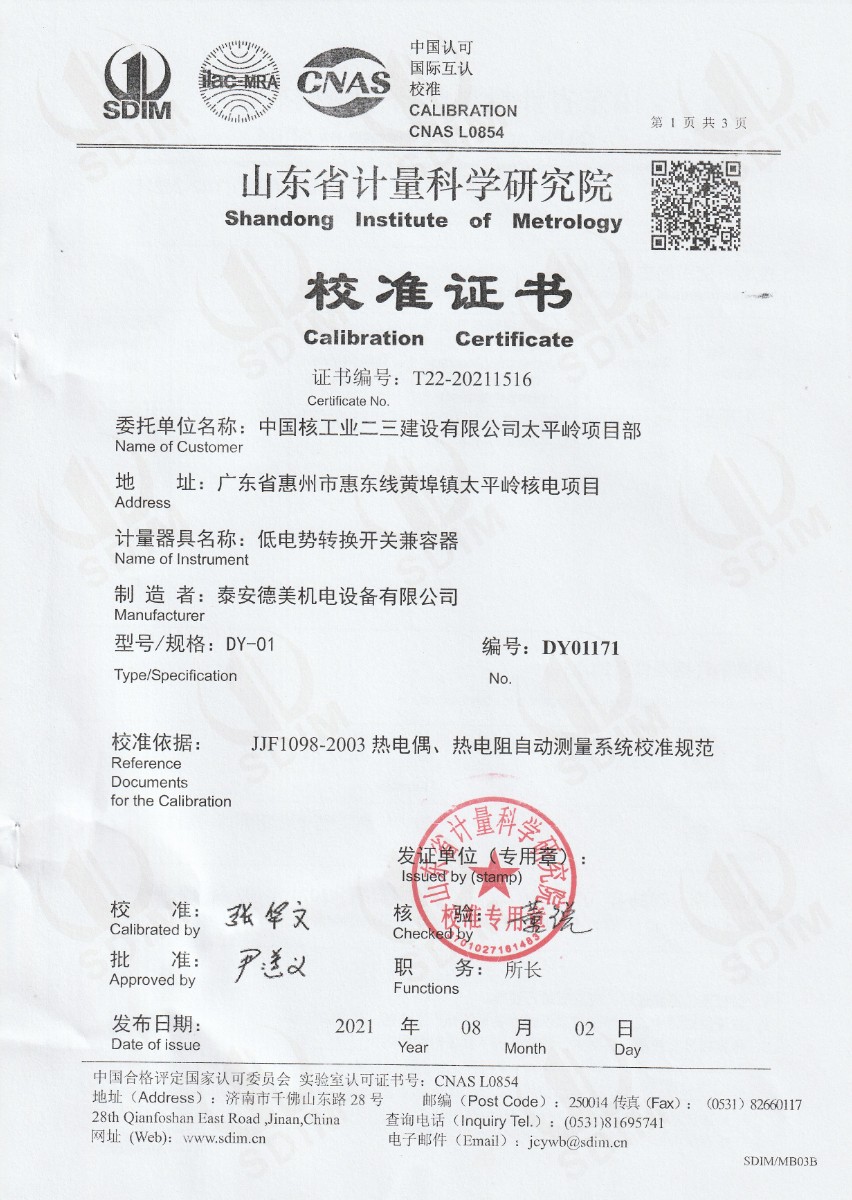上一條:中國核工業(yè)二三建設有限公司太平嶺項目部水平尺專用校準臺下一條:超低溫面源黑體爐(-40-80℃)校準證書