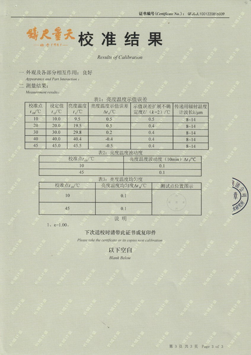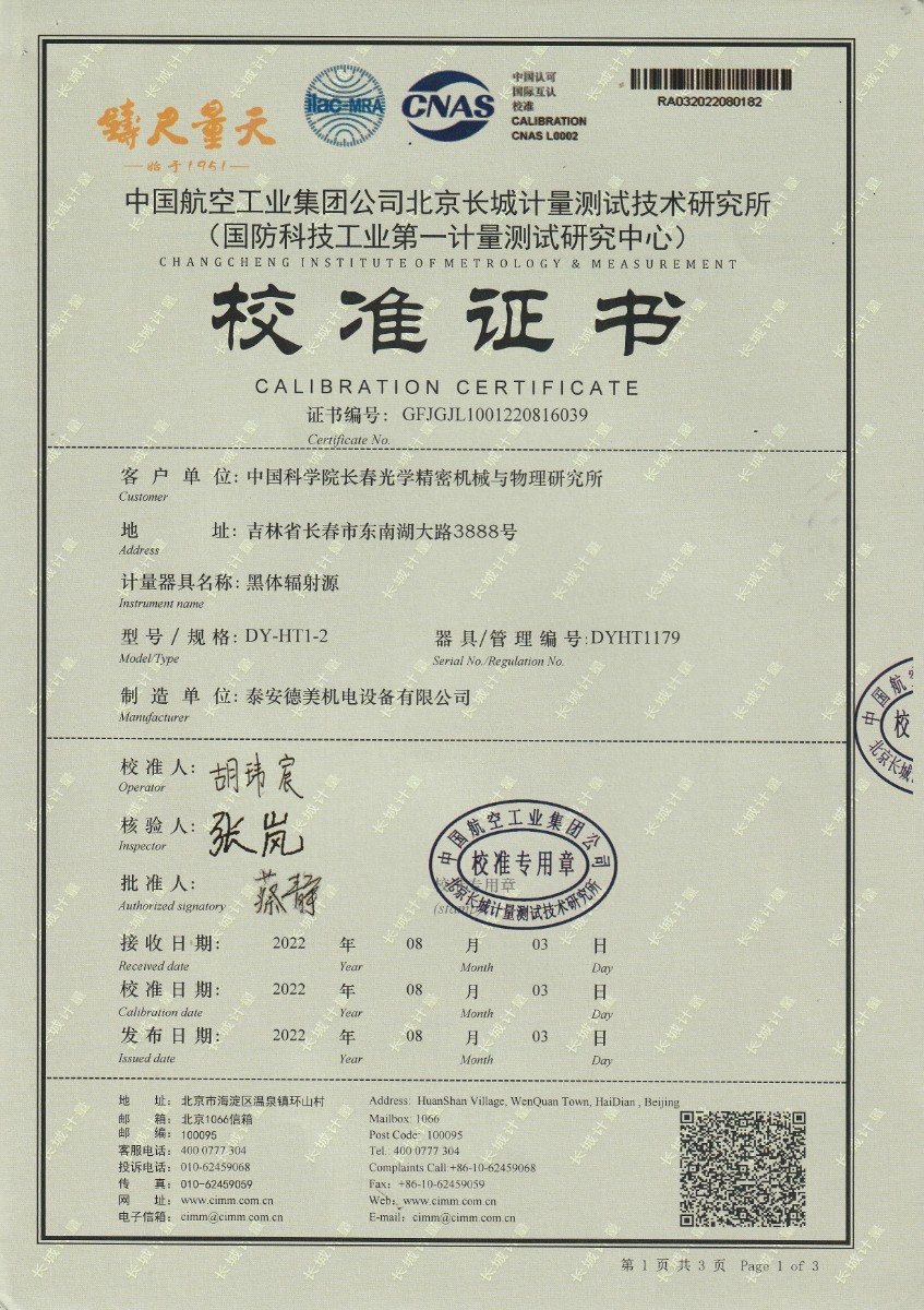 上一條:中國(guó)科學(xué)院長(zhǎng)春光學(xué)精密機(jī)械與物理研究所-黑體爐DY-HT1-1 | 下一條:超低溫面源黑體爐(-40-80℃)校準(zhǔn)證書(shū) |