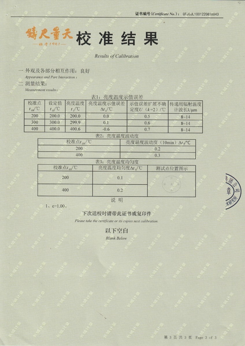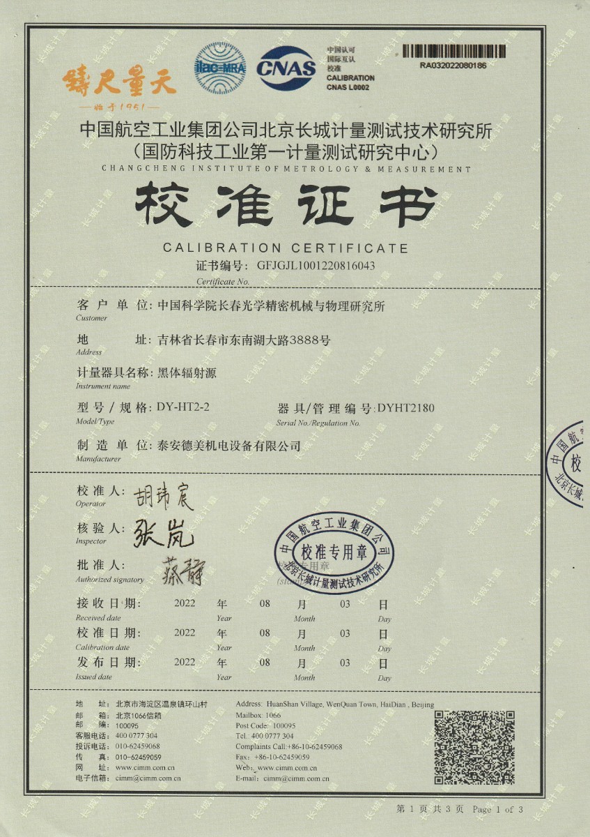 上一條:中國(guó)科學(xué)院長(zhǎng)春光學(xué)精密機(jī)械與物理研究所-黑體爐DY-HT2-1 | 下一條:超低溫面源黑體爐(-40-80℃)校準(zhǔn)證書 |