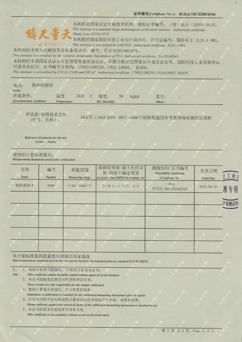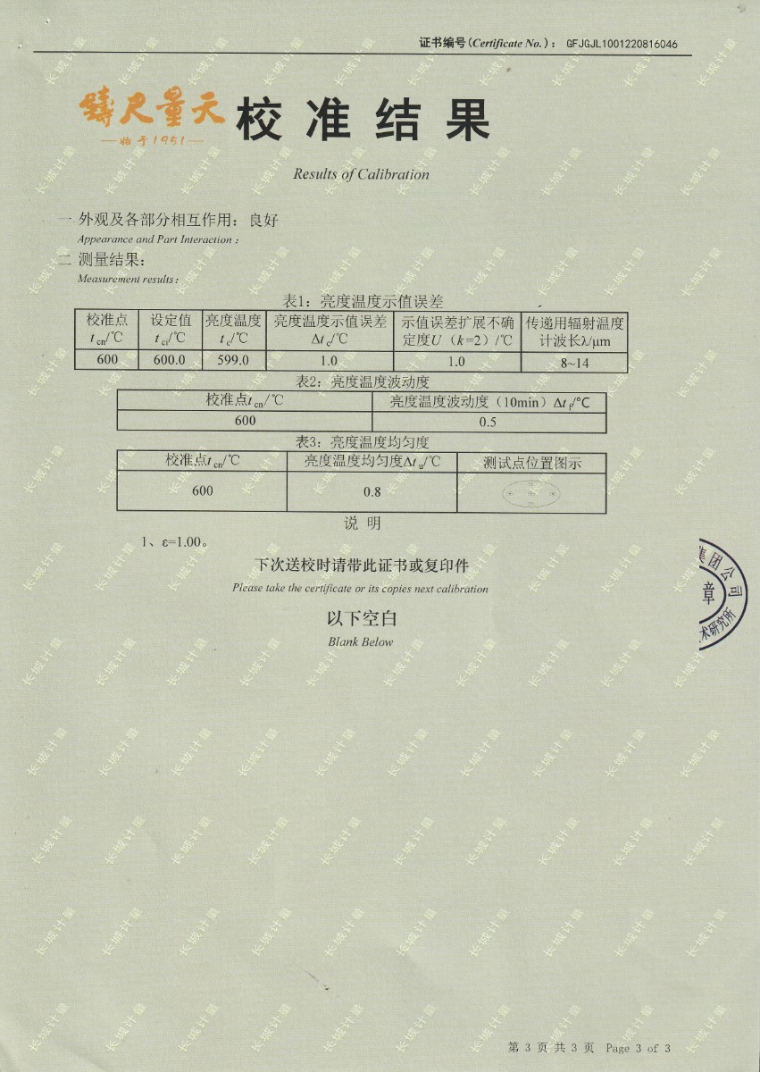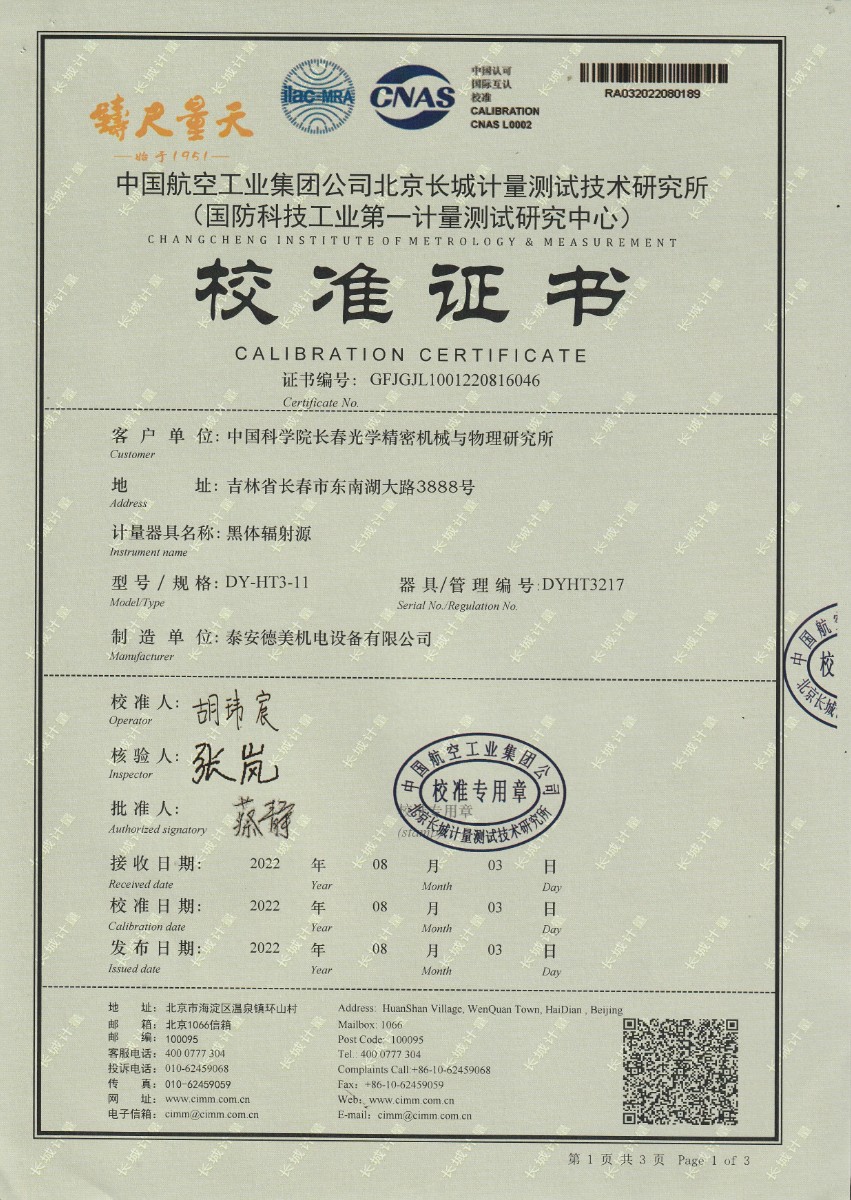 上一條:中國科學院長春光學精密機械與物理研究所-黑體爐DY-HT3-2 | 下一條:超低溫面源黑體爐(-40-80℃)校準證書 |