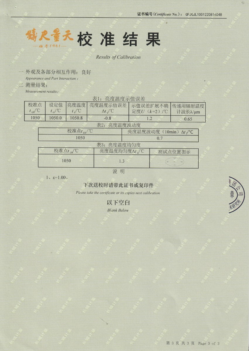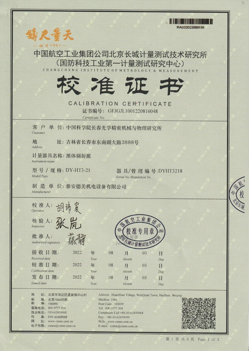 上一條:中國(guó)科學(xué)院長(zhǎng)春光學(xué)精密機(jī)械與物理研究所-黑體爐DY-HT3-11 | 下一條:超低溫面源黑體爐(-40-80℃)校準(zhǔn)證書(shū) |