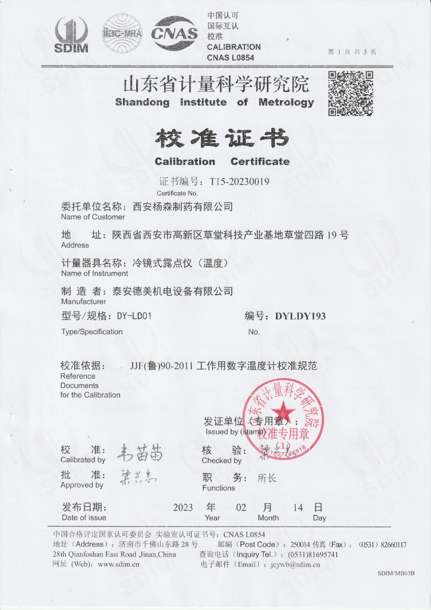 上一條:西安楊森制藥有限公司 冷鏡式露點(diǎn)儀 檢定證書 | 下一條:便攜式干體爐(-30-150℃)校準(zhǔn)證書 |