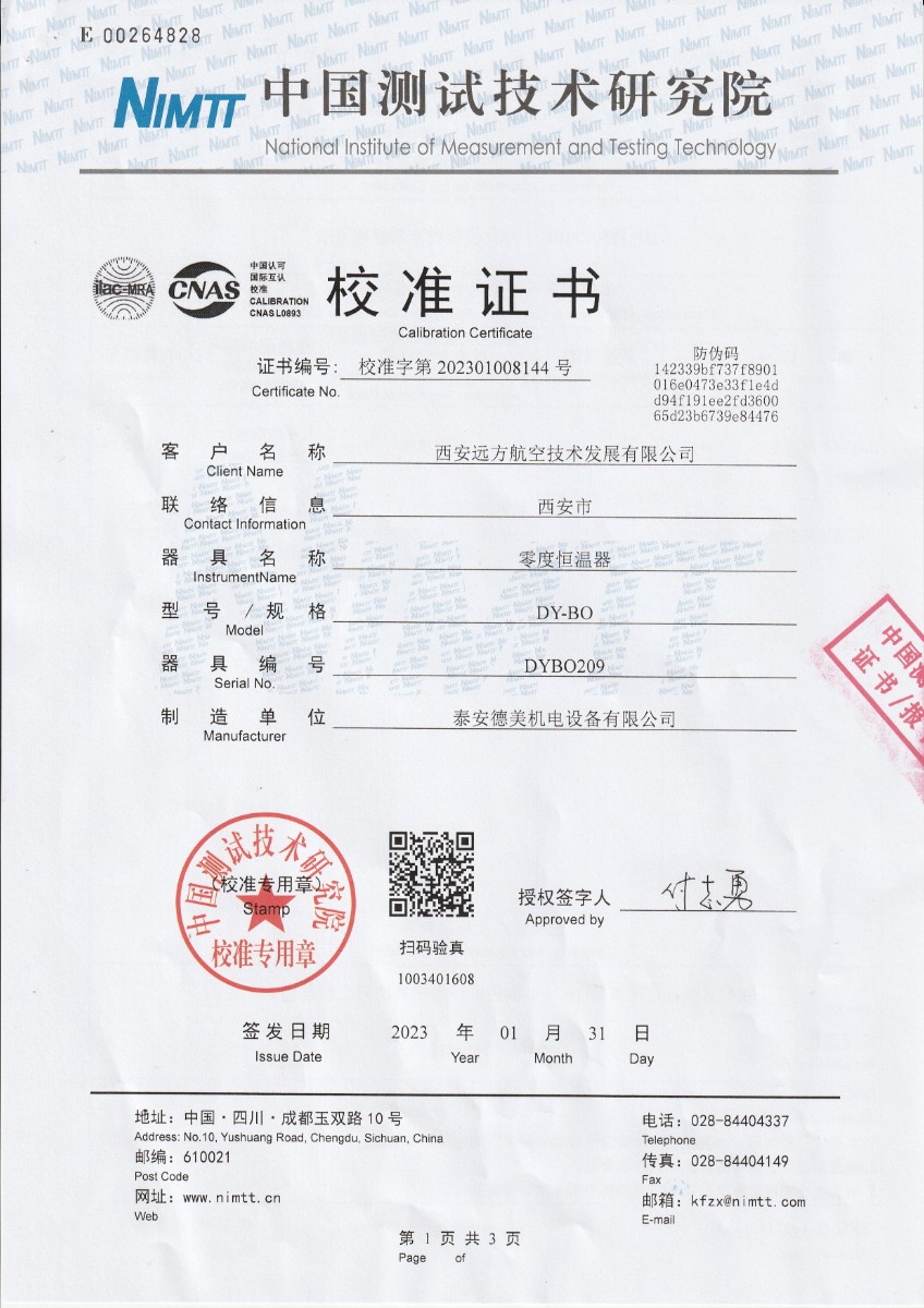 西安遠(yuǎn)方航空技術(shù)發(fā)展有限公司 零度恒溫器 校準(zhǔn)證書 2023-4-10 本文被閱讀 13727 次