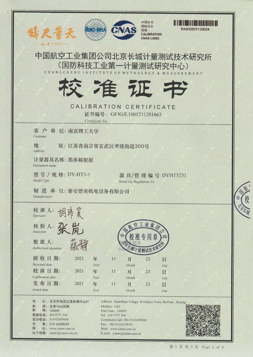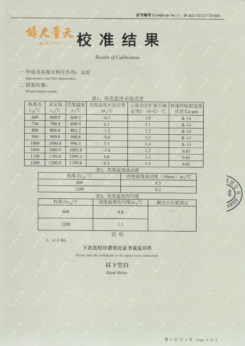 | 上一條:南京理工大學(xué)-黑體輻射源校準證書350-800℃ | 下一條:便攜式干體爐(-30-150℃)校準證書 |