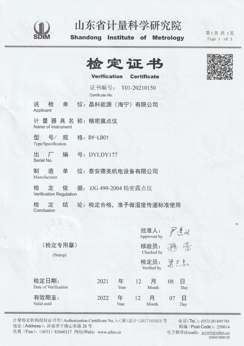 晶科能源(海寧)有限公司-精密露點儀(濕度) 2021-12-14 本文被閱讀 13669 次
