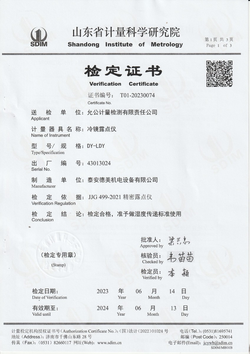 上一條:允公計(jì)量檢測(cè)有限責(zé)任公司-冷鏡露點(diǎn)儀校準(zhǔn)證書 | 下一條:超低溫面源黑體爐(-40-80℃)校準(zhǔn)證書 |