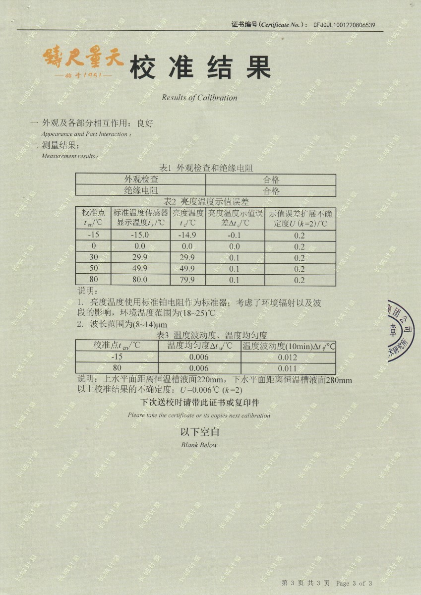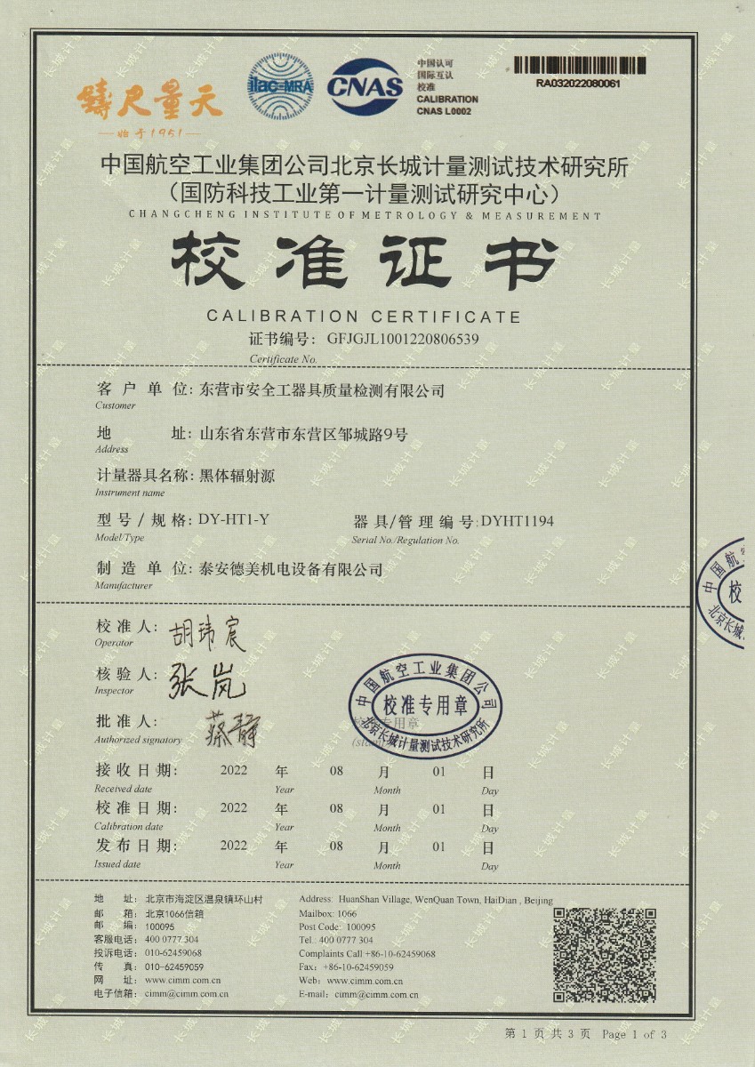 | 上一條:東營市安全工器具質(zhì)量檢測有限公司-黑體輻射源DY-HT2 | 下一條:便攜式干體爐(-30-150℃)校準(zhǔn)證書 |