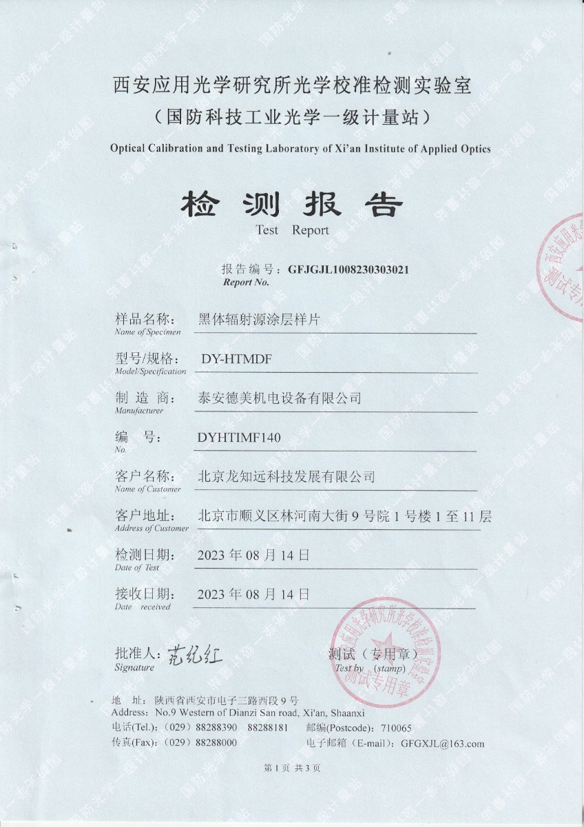 北京龍知遠科技發(fā)展有限公司-黑體輻射源涂層樣片DYHT1MF140檢測報告
