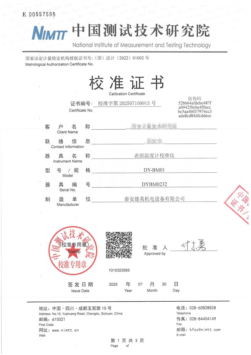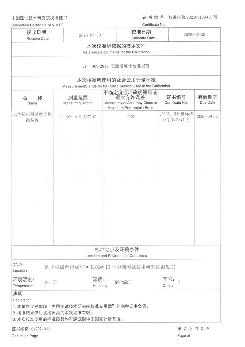 表面溫度計校準儀(40-400℃)校準證書 2025-8-6 本文被閱讀 1700 次