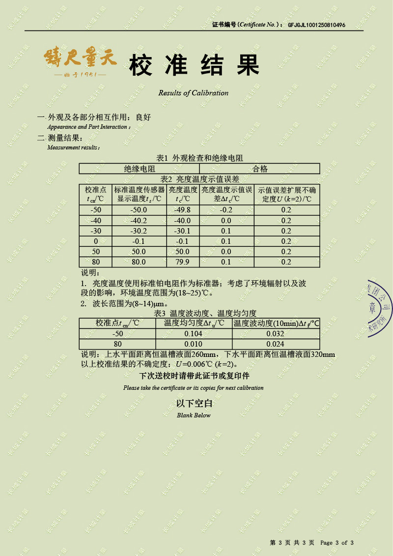 低溫浴式黑體輻射源(-55-80℃)校準(zhǔn)證書(shū)
