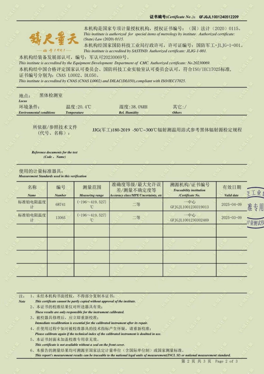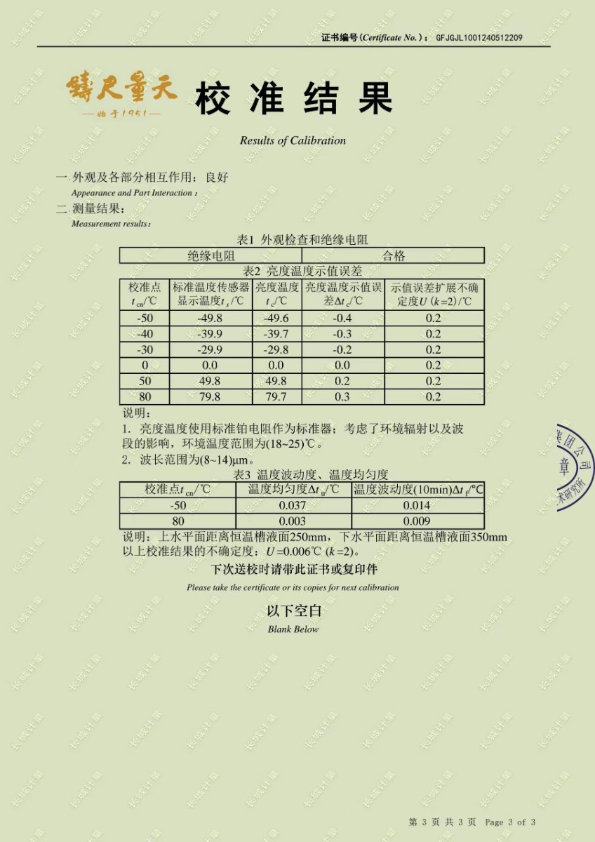 低溫浴式黑體輻射源校準證書 2024-5-31 本文被閱讀 7965 次